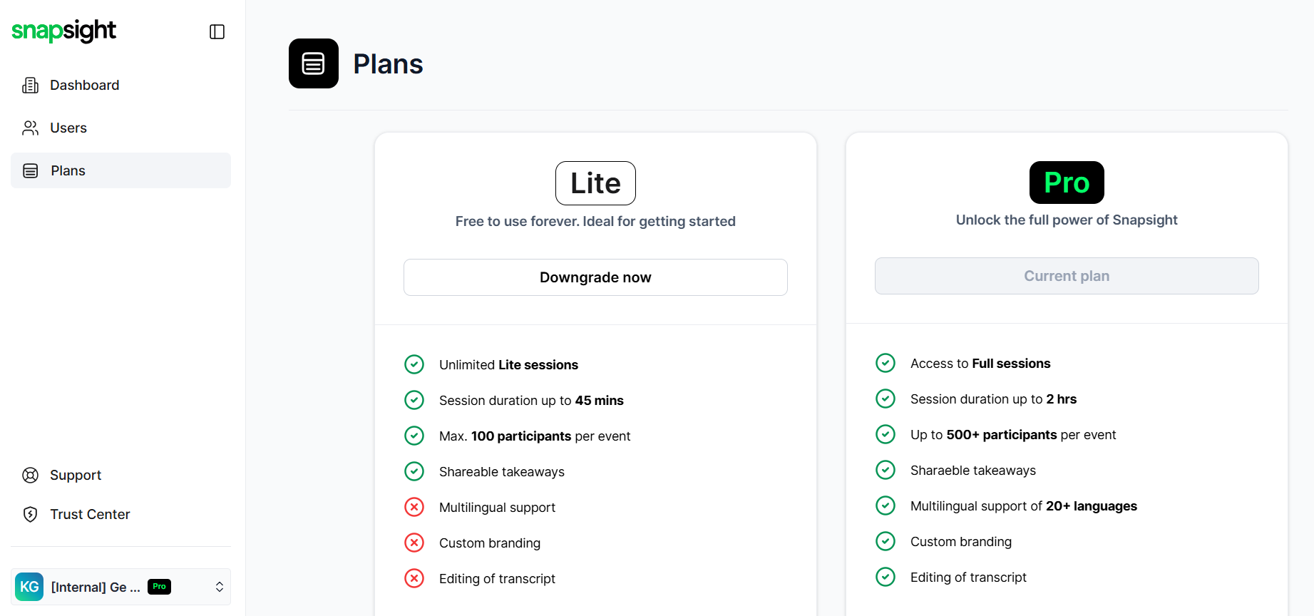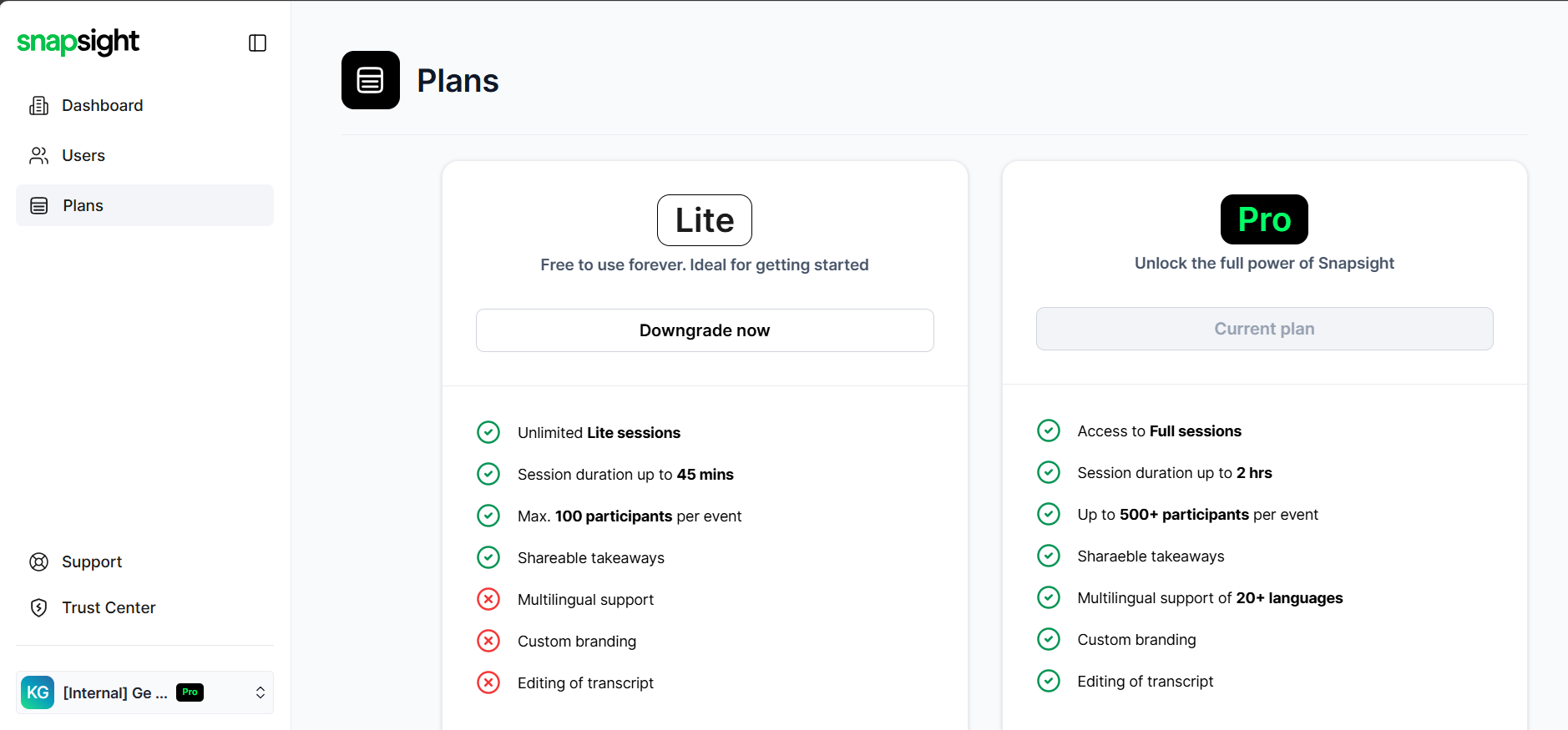 Managing your subscription in snapsight is straightforward. You can upgrade from the Lite plan to the Pro plan or downgrade back to Lite if needed.