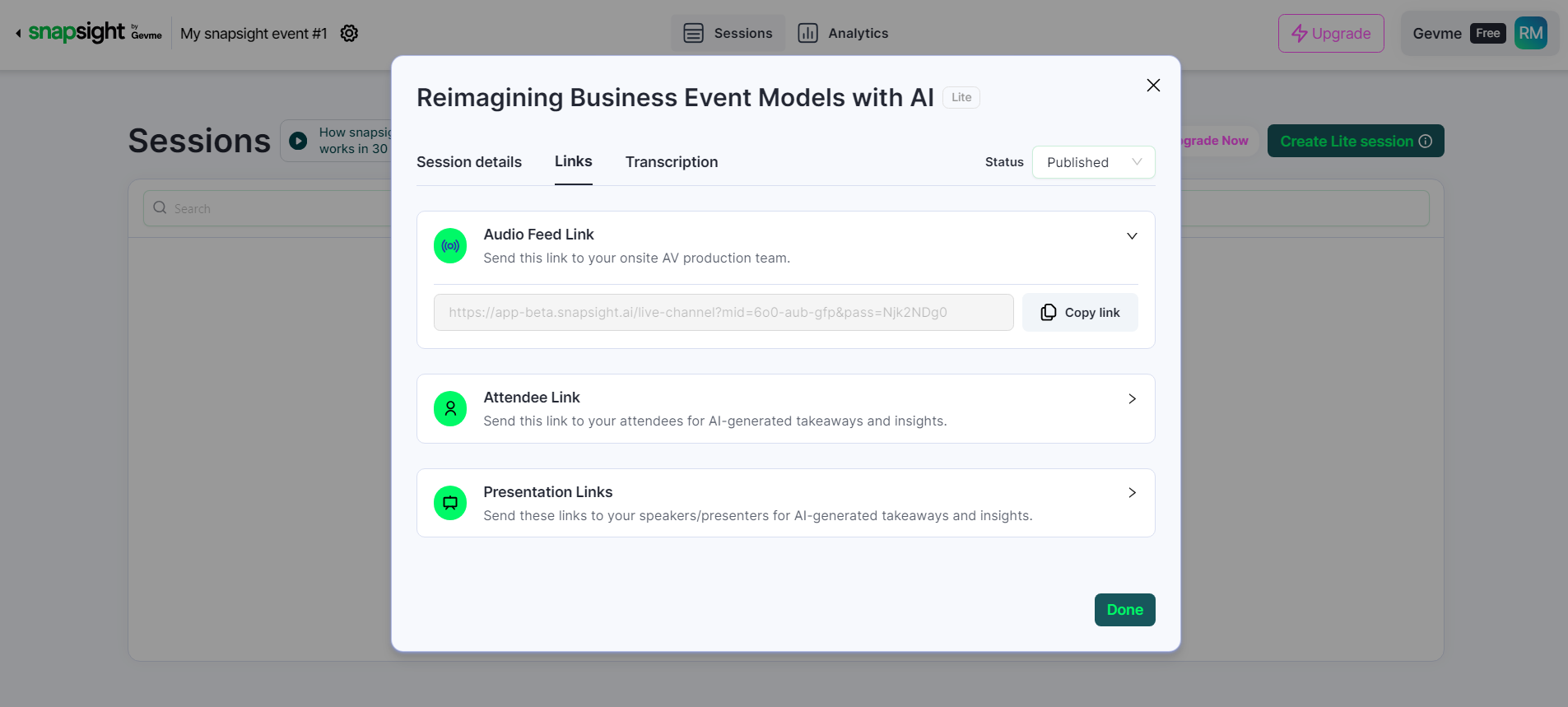 - Locate the Real-time Takeaways Session Audio Feed Link: The session-specific audio feed link can be found in the within created Snapsight Session. This link is crucial for establishing the connection between Snapsight and the AV equipment.