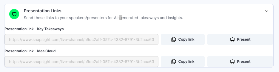 - Presentation Links: To be shared with speakers or presenters for AI-generated takeaways and insights.