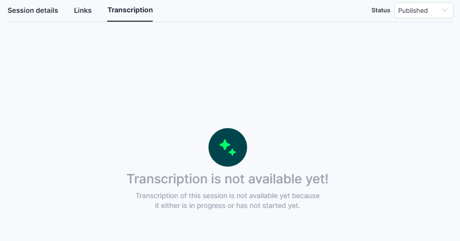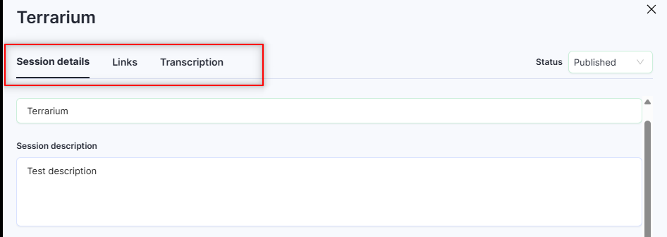 This section provides a preview of all the information entered during session creation, including the title, description, date, time, and speakers.