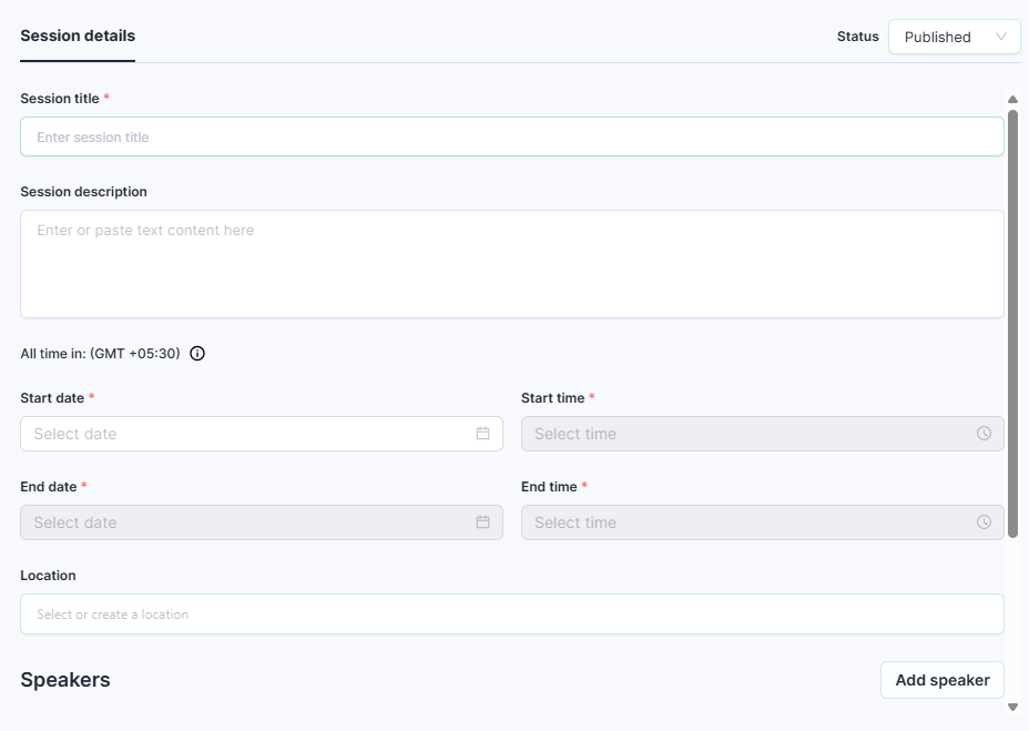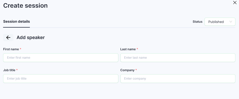 If the session has speakers, click on the Add Speaker button and fill in their information such as name, bio, and role in the session.