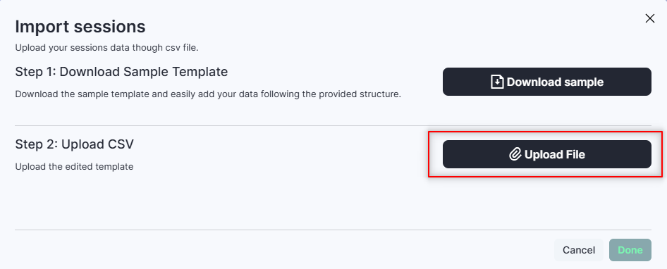 Simply click on the 'Upload file' button and select the CSV file. After a successful import, you will receive a confirmation message indicating that the sessions have been successfully imported.