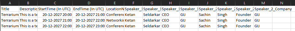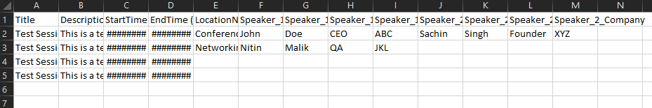 Open the downloaded CSV file and update it with your session information. Ensure that all required fields are filled in according to the format specified in the sample data.