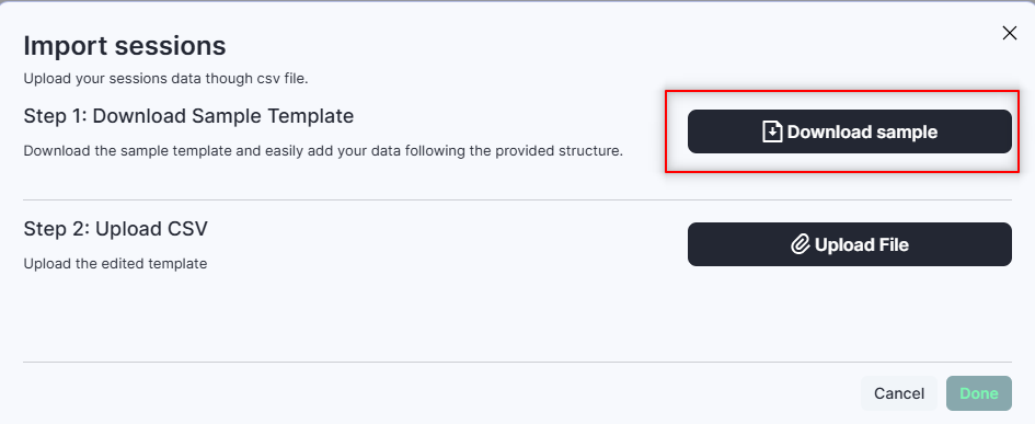 A pop-up window will appear. Click on the Download Sample button to download a sample CSV file. This file contains the required fields for session creation along with sample data to serve as a reference.