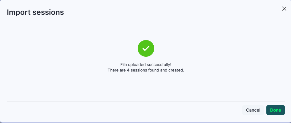 Simply click on the 'Upload file' button and select the CSV file. After a successful import, you will receive a confirmation message indicating that the sessions have been successfully imported.